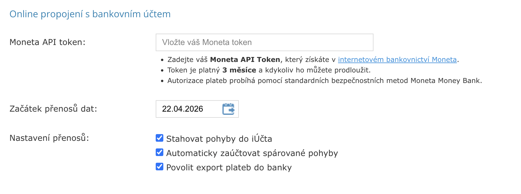 Přihlaste se do iÚčta a přejděte do Nastavení → Bankovní účty. Vyberte (nebo přidejte) bankovní účet u MONETA Bank. V sekci Online propojení s bankovním účtem uvidíte formulář pro zadání API tokenu.